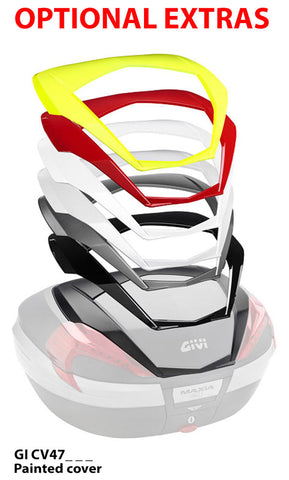 The Givi V47 top box is great looking with new modern lines, a carbon look finish, and smoke reflectors. It comes with the new hinge system that allows you to close the lid with a simple push and a new gasket system for even greater water resistance. With a 47lt capacity this box will hold two modular helmets.